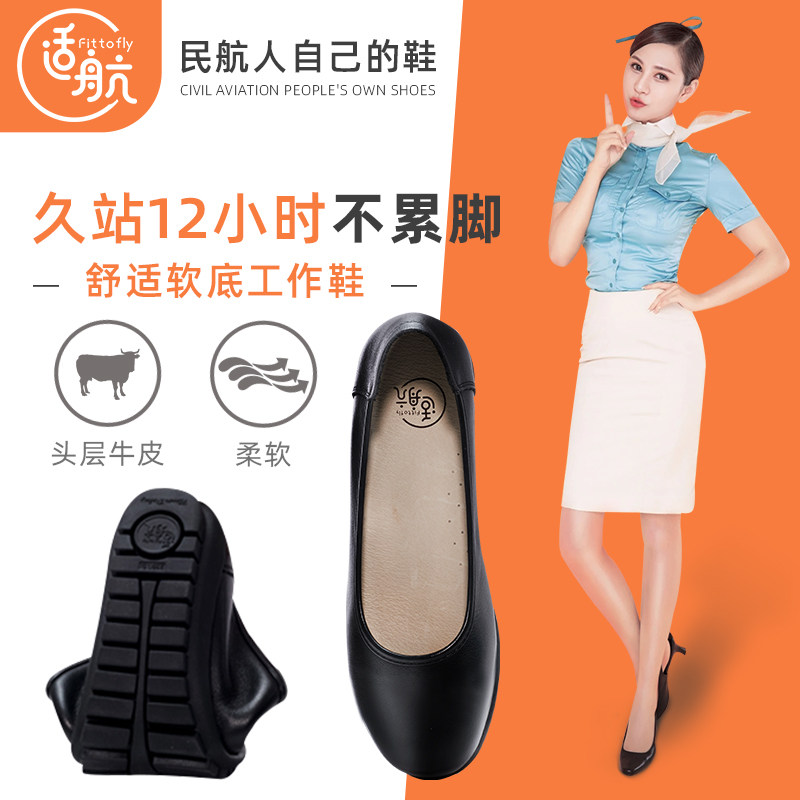 空姐工作鞋女黑色真皮工装鞋软底舒适久站不累酒店上班职业平底鞋